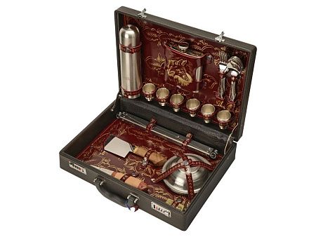 нож, нож-тяпка, зажигалка, тарелка, шампур- 6шт, термос, стопка- 6шт, фляжка, вилка - 6шт, ложка - 6шт