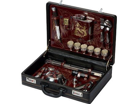 нож складной, штопор, тарелка-6шт, воронка, нож"Басмач", стопка-6шт, нож"Кореш", зажигалка, стопка с узором-6шт, фляга, ложка-6шт, вилка-6шт, фонарь