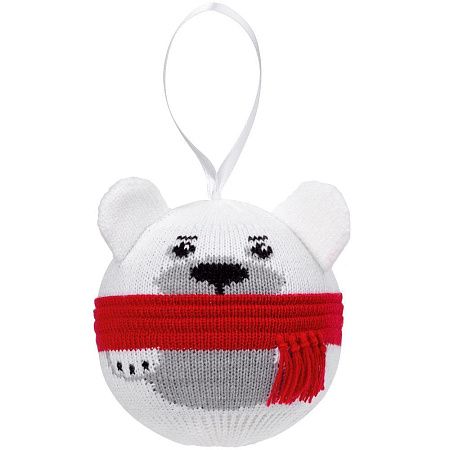 Елочный шар с вывязанным логотипом и индивидуальным рисунком в фирменной цветовой гамме.