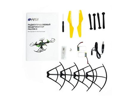 квадрокоптер, ПУ, аккумулятор- 2шт, usb кабель, запасные лопасти, запасные винты, стойка шасси- 4шт, защита пропеллеров, отвертка, инструкция