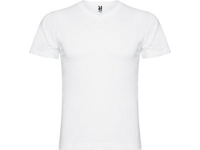Мужская футболка без боковых швов с коротким рукавом и V-образным вырезом горловины, отделанном рибом 1х1. Горловина и плечевые швы дополнительно укреплены тесьмой.