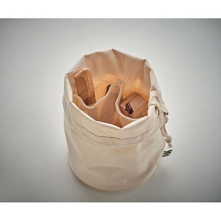 Сумка-мешок для аксессуаров среднего размера из органического хлопка. 220 гр/м². Имеет внутренние сетчатые отделения и деревянную застежку.