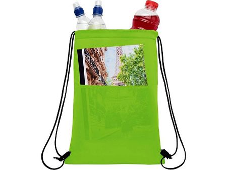 Сумка-холодильник затягивается на шнурок черного цвета. С открытым передним карманом. Вмещает 12 банок. Прочность до 5 кг.