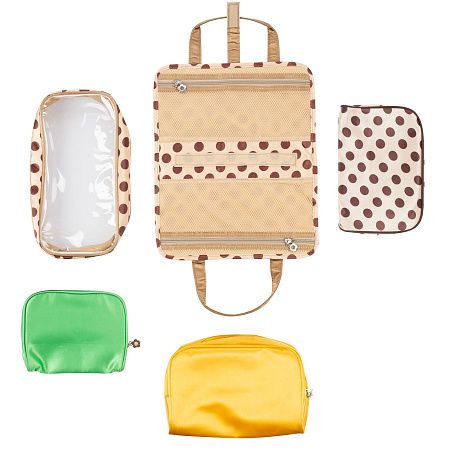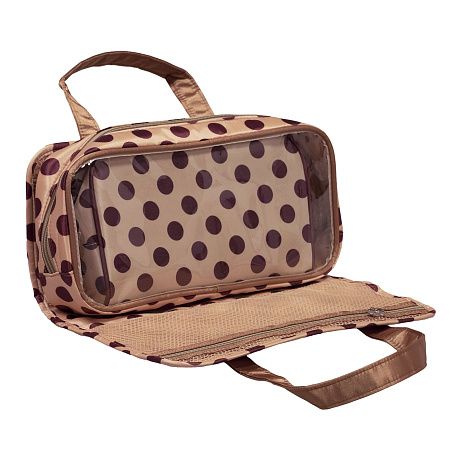 Обложка для косметичек: размер в разложенном виде 40х30см (плоская), длина ручек 11 см, закрывается на хлястик (15 см) на липучке, материал полиэстер/сатин, 2 кармана-сетки (нейлон) на молнии, посередине на дне одна сторона липучей ленты для крепления косметички 1;