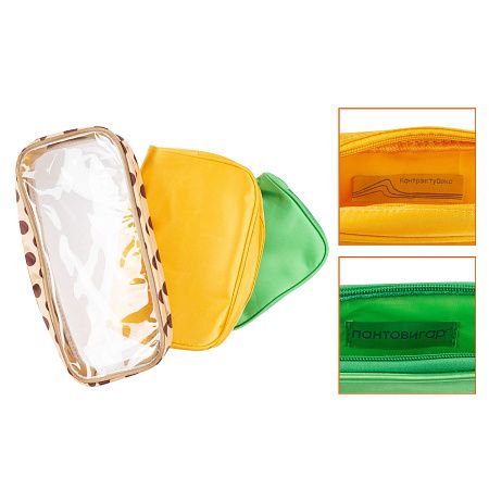 Косметичка 1: 30х15х10 см, материал полиэстер/сатин + ПВХ прозрачные окошки с обеих сторон, молния, вторая часть липучей ленты для крепления на обложке;