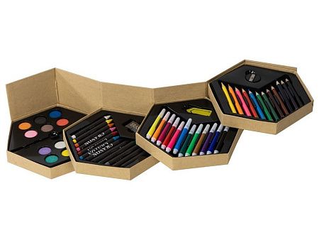 маркер - 12шт, цветные карандаши - 12шт, восковые карандаши - 12шт, акварельные краски - 12шт, кисточка, точилка, ластик, скрепка