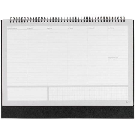 Настольный недатированный планер на открытой пружине. Обложка из белого мелованного картона, подложка из плотного картона в материале Petrus, черный АА.