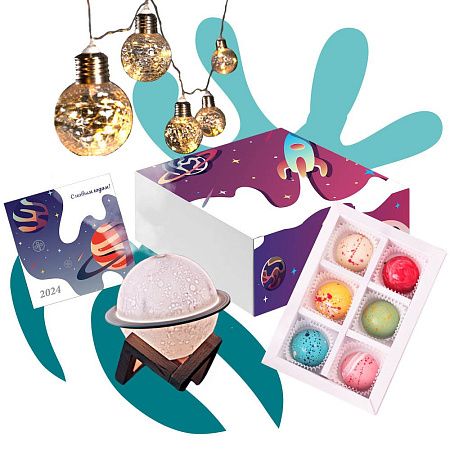 Открытка с космическим дизайном станет прекрасным дополнением к набору. На ней можно написать тёплые пожелания и поздравления.