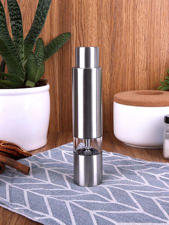 Компактная ручная мельница с пружинным механизмом и металлическими жерновами.