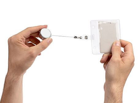 Ретрактор крепится к одежде, а с другой стороны можно поместить бейдж, визитку или магнитную карту. В корпусе спрятан сворачивающийся шнур, который позволяет при необходимости демонстрировать содержимое держателя, не снимая его.