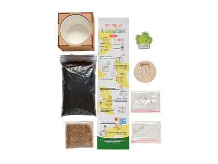 деревянное кашпо из фанеры, бумажный стаканчик, грунт, семена, вермикулит, иконка с изображением растения, шубер