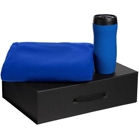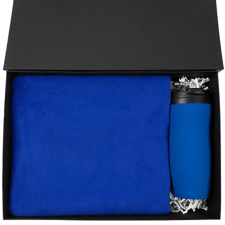 термостакан - пластик, крышка, внутренняя колба; нержавеющая сталь, корпус; покрытие софт-тач; плед - флис, плотность 180 г/м²; коробка - переплетный картон; наполнитель - бумага