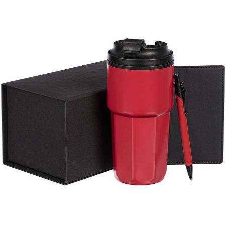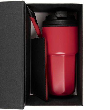 термостакан - нержавеющая сталь, полипропилен; обложка для паспорта - искусственная кожа; ручка - металл, пластик; коробка - переплетный картон