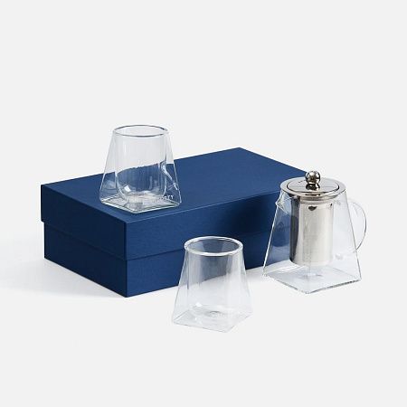 чайник, стаканы - боросиликатное стекло; крышка и сито - нержавеющая сталь; коробка - переплетный картон