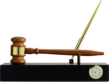 подставка с часами 29,3 х 11,7 х 8 см, молоток d4,5 х 7,5 х 26,2 см, ручка шариковая d1 х 17,6 см, шильд 22,2 х 3,5 см