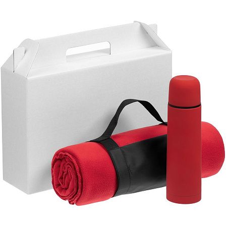 плед - флис, плотность 180 г/м²; термос - нержавеющая сталь, 304 внутри, 201 снаружи, пластик, покрытие софт-тач; коробка - микрогофрокартон