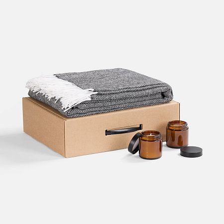плед - шерсть, 15%; хлопок, 5%; полиэстер, 60%; акрил, 20%, плотность 200 г/м²; подсвечник - стекло, крышка - пластик; свеча - парафин, соевый воск, парфюмерная композиция; коробка - микрогофрокартон, Т-23Е