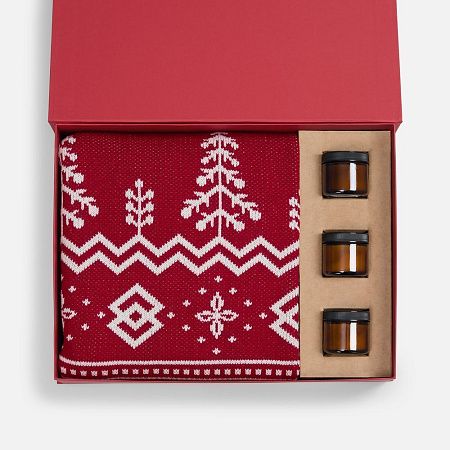 плед - акрил 100%, плотность 430 г/м²; подсвечник - стекло, крышка - пластик; свеча - парафин, соевый воск, парфюмерная композиция; коробка - переплетный картон, бумага classy covers