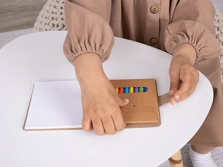 В комплекте 11 цветных восковых мелков и блокнот на 40 страниц для раскрашивания и рисования: 12 страниц с рисунками и 28 чистых страниц. Блокнот и мелки компактно хранятся под одной обложкой.