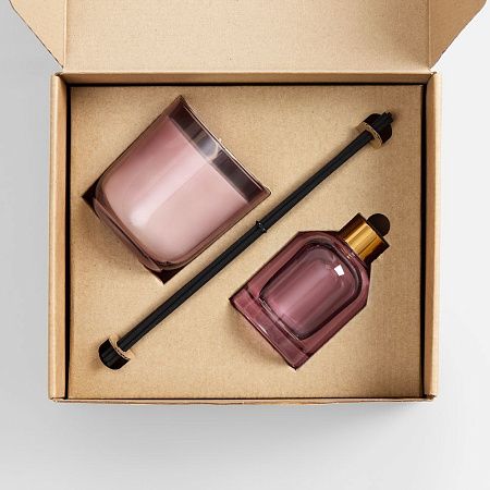 флакон, подсвечник - стекло, палочки из файбера; свеча - воск; коробка - микрогофрокартон, плотность 385 г/м²