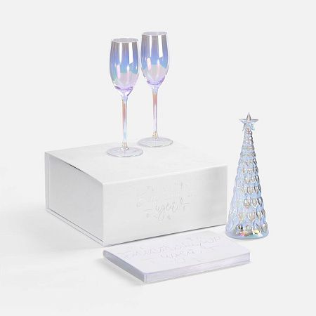 Секрет прост: это особенное перламутровое напыление бокалов и стеклянной елочки-светильника, а еще серебристое голографическое тиснение на самой упаковке и ежедневнике с главным — и всегда актуальным — пожеланием. В такой компании блестящие идеи, без сомнения, будут посещать намного чаще, чем обычно, а весь год будет окрашен в яркие тона, искрящиеся радостью!