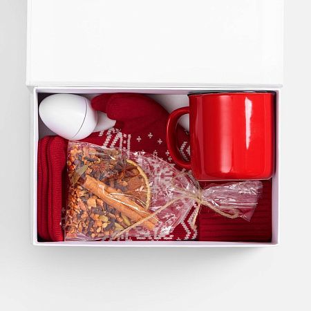 варежки - акрил 100%; футляр для бальзама - пластик; кружка - фаянс; плетеная фигурка - бумага; коробка - переплетный картон, бумага malmero «Скандинавский синий»