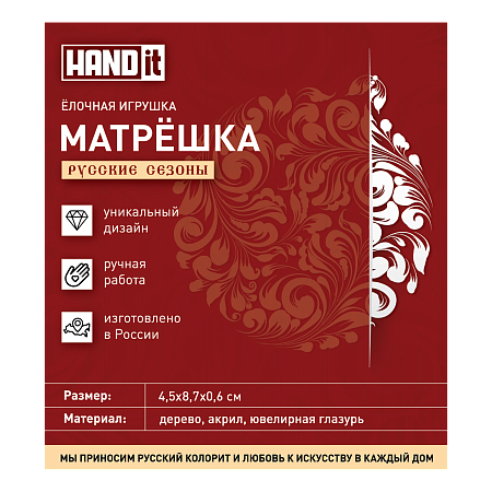 Бренд HANDit—российский бренд изделий из дерева, акрила и ювелирной глазури. В линейке бренда новогодние игрушки, настольные игры и брелки. Каждая игрушка изготовлена вручную.