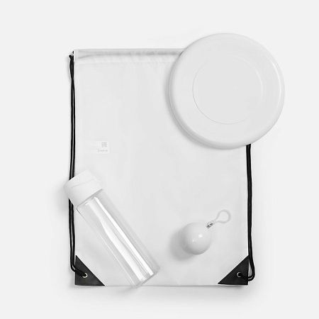 бутылка, футляр, тарелка-фрисби - пластик; плащ - полиэтилен, ПНД, плотность 12 мкм; рюкзак-мешок - спанбонд, плотность 70 г/м²