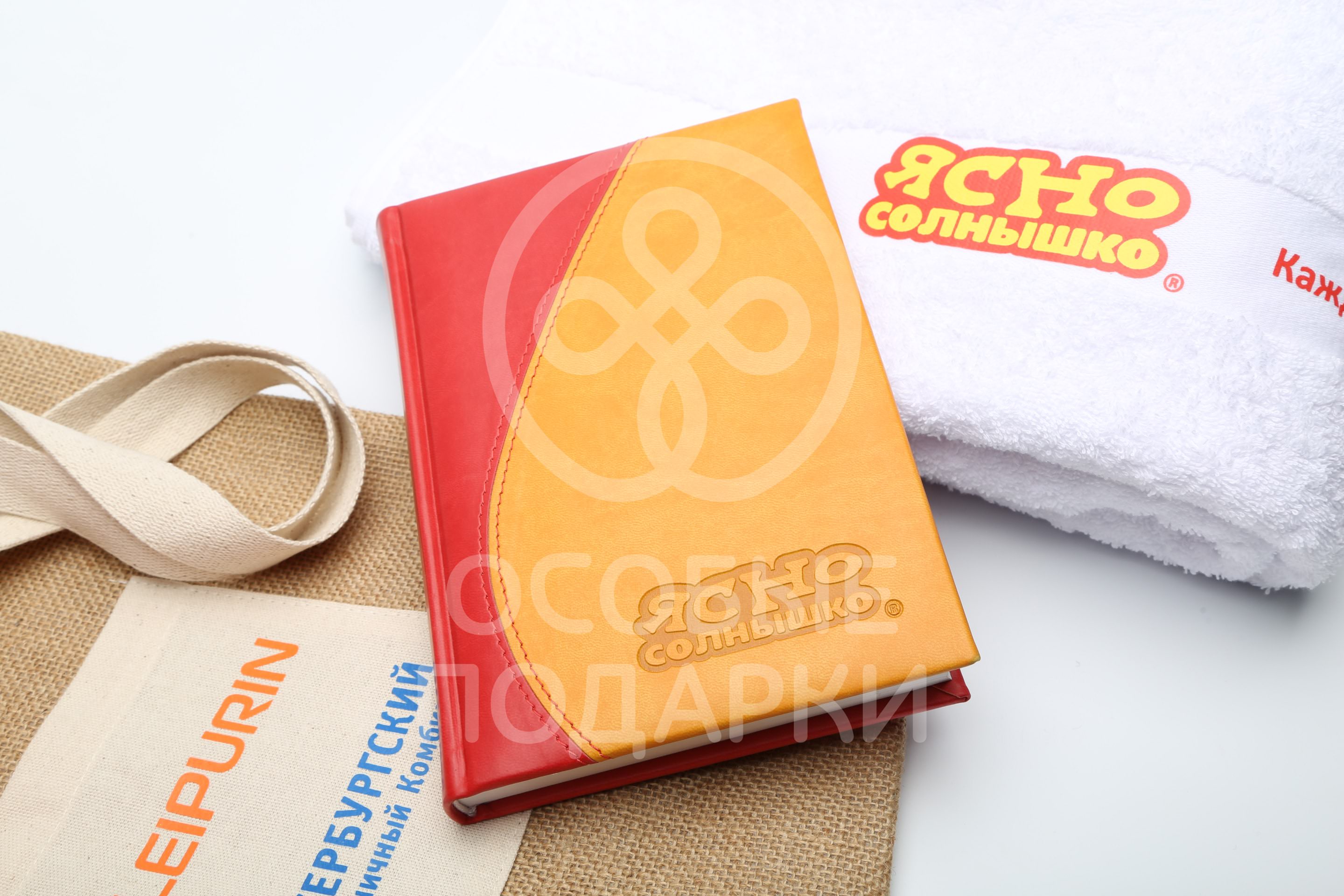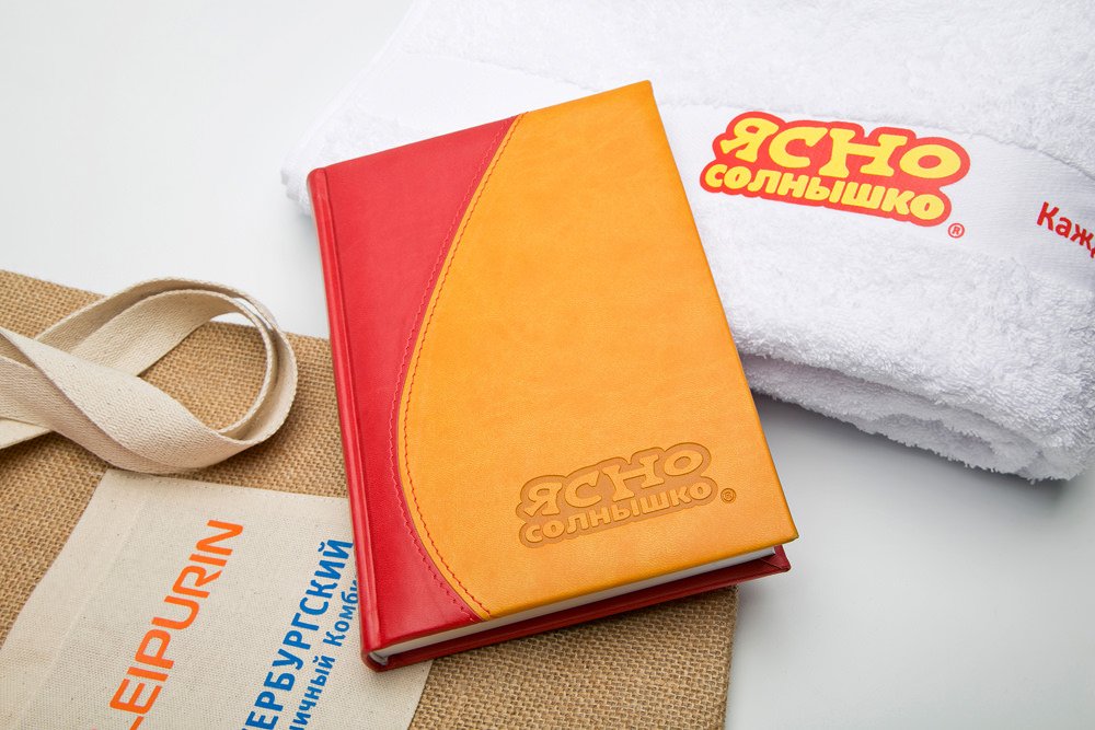 Для Петербургского мельничного комбината был выполнен заказ на эко-сумки для покупок, яркие ежедневники и кепки-козырьки и полотенца с лого бренда "Ясно-Солнышко".