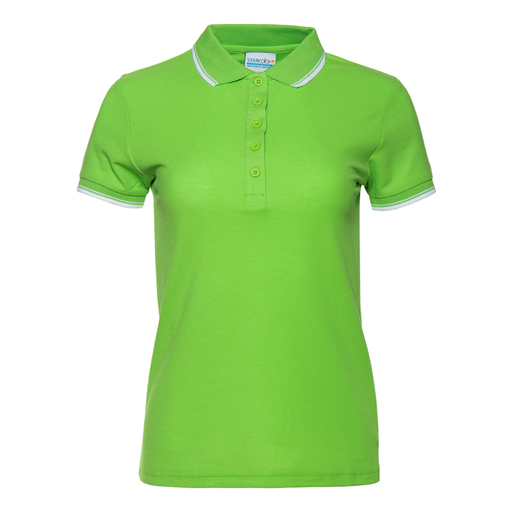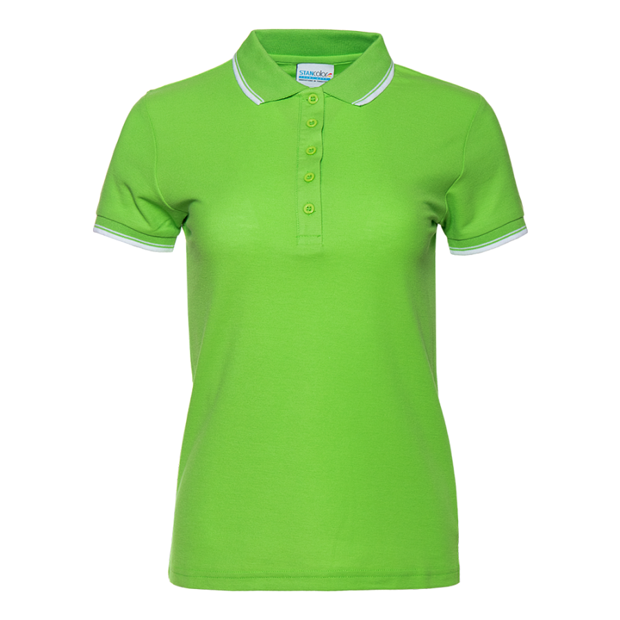 Женское поло приталенного силуэта с отложным воротником, втачным коротким рукавом и застежкой на пуговицы. Воротник и манжет выполнены контрастной резинкой.