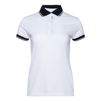 Женская рубашка поло приталенного силуэта с контрастным отложным воротником и манжетом, втачным коротким рукавом и застежку на пуговицы. Асимметричный крой гарантирует свободу движения и защиту спины от продувания ветром.