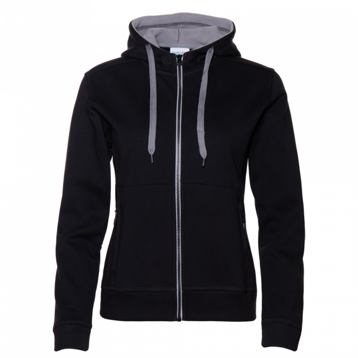 Женская толстовка прямого силуэта с капюшоном комфортной глубины, втачным рукавом, прорезным карманов и застежкой на контрастную молнию. Капюшон дополнен плоским шнурком для регулировки прилегания, манжет и низ изделия выполнены из основного полотна.