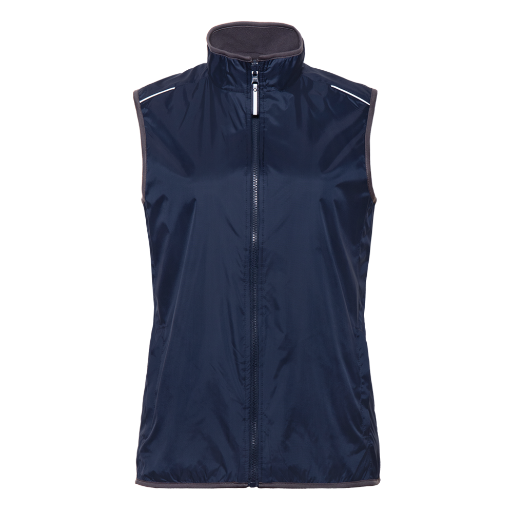 Женский жилет приталенного силуэта с воротником-стойкой, прорезным карманом и застежкой на молнию. Модель дополнена светоотражающими элементами на плечах, подвижной части застежки-молнии и по спинке изделия.