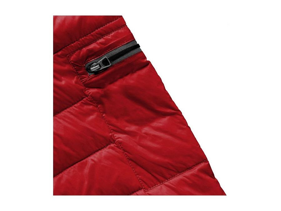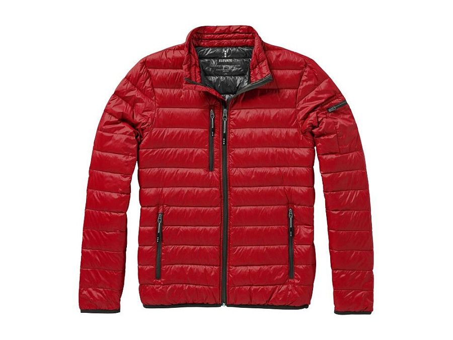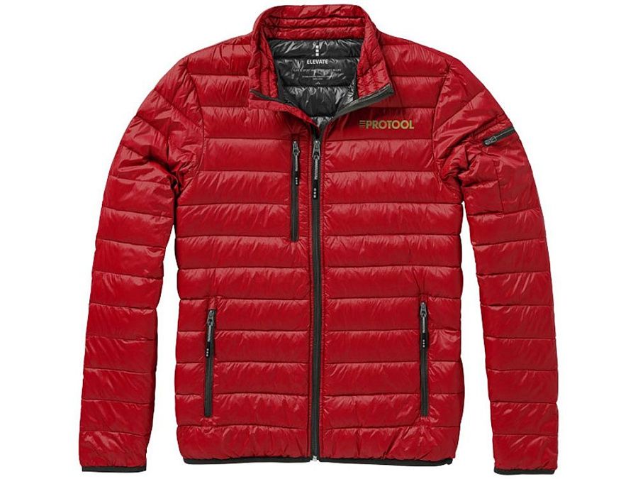 Легкая куртка Scotia. Стандартный покрой. Ткань не пропускает пух. Карманы для рук и нагрудный на молнии. Карман на рукаве на молнии можно использовать для нанесения. Резинка на манжетах и внизу куртки. Ремешки на собачку (второй комплект в цвете антрацит). Внутренний противоветровой клапан и защита подбородка. Ткань дышащая, ветронепроницаемая и влагоотталкивающая. Отражающий лого сзади. Легкий пуховик. Ткань из 100% нейлона с матовым и блестящим водоотталкивающим покрытием, 20D. 80% пух и 20% перо. 115 г/м².