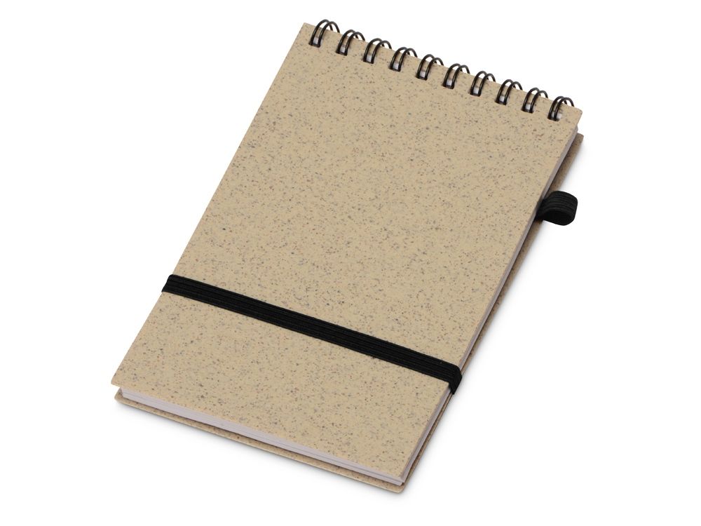 Блокнот с обложкой из переработанной пшеницы и пластика. Блок состоит из 60 листов переработанной бумаги белого цвета. Крепление - пружина. Дополнен петлей для ручки и горизонтальной резинкой.
