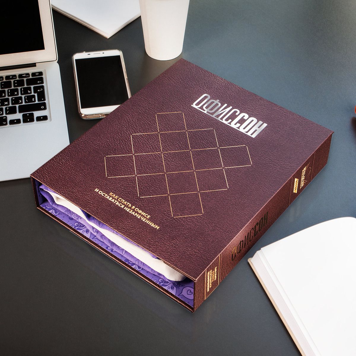 Набор для людей, знакомых с офисной жизнью и обладающих хорошим чувством юмора. Уникальный подарок, который поможет незаметно вздремнуть посреди рабочего дня. Просто откройте этот набор, маскирующийся под огромный фолиант, и вы найдёте всё необходимое, чтобы устроить на рабочем месте незаметное «сонное царство». Необычная концепция, качественный дизайн, лёгкая креативная подача набора, а также множество шуток заряжают позитивом и позволяют немного отвлечься от офисной рутины.