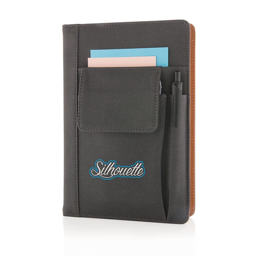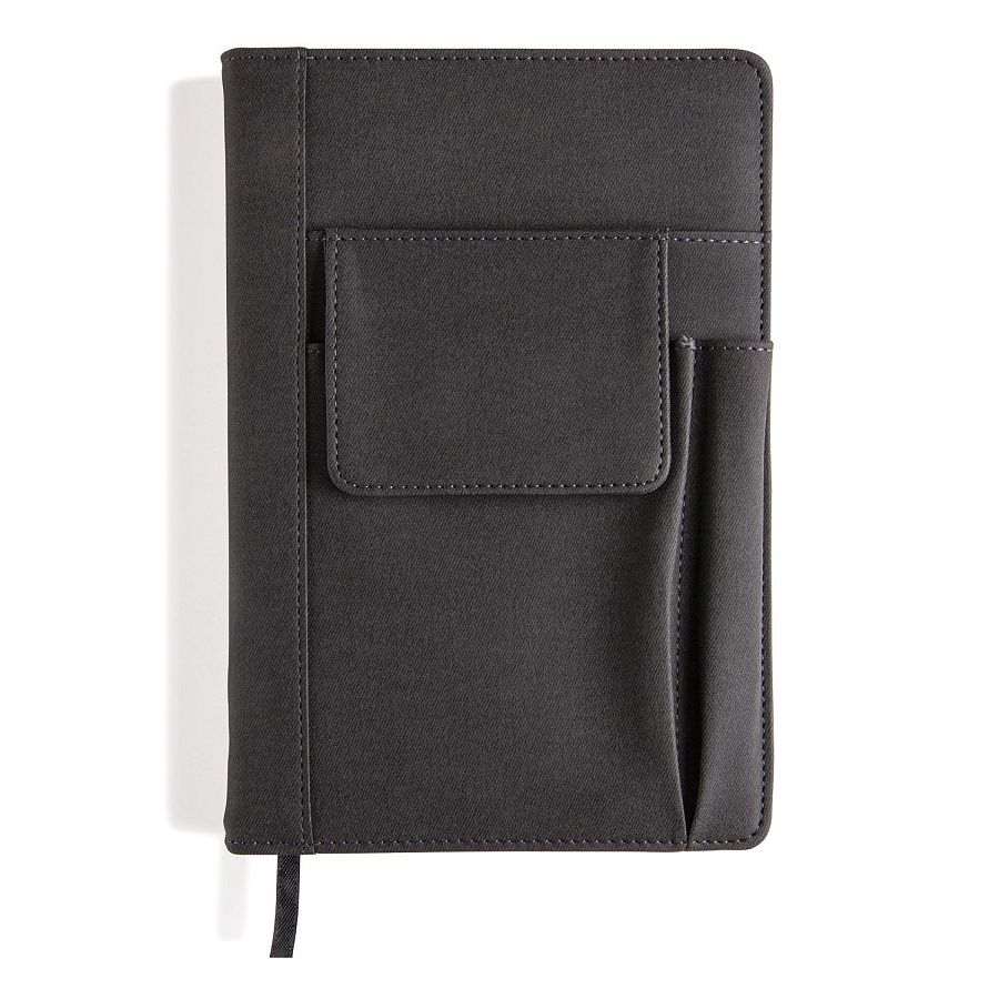 Тканевая обложка блокнота с передним отделением для телефона (14 х 10 см), с кармашком для пишущих принадлежностей и основным отделением для визиток или внешнего аккумулятора. Блокнот на 80 страниц, плотность бумаги 80 г/м2. После того как блокнот закончится, его легко поменять на новый.