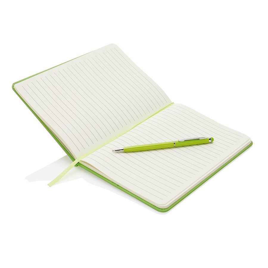 Блокнот для записей Deluxe формата A5 с кармашком для ручки и ручкой-стилус в комплекте. Упакован в подарочную коробку. Блок формата А5 на 80 страниц, плотность бумаги 80 г/м2.