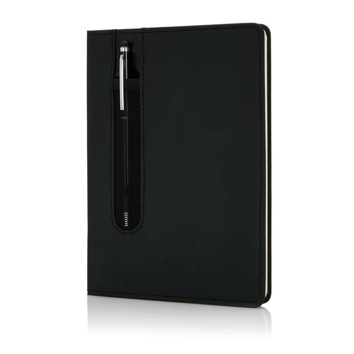 Блокнот для записей Deluxe формата A5 с кармашком для ручки и ручкой-стилус в комплекте. Упакован в подарочную коробку. Блок формата А5 на 80 страниц, плотность бумаги 80 г/м2.