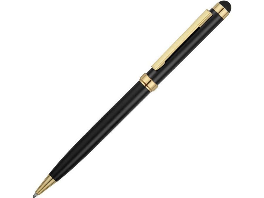 Стильная металлическая ручка со стилусом «Голд Сойер» – по-настоящему универсальный пишущий инструмент. Ею можно делать записи на бумаге, а перевернув, работать с емкостными экранами с помощью стилуса. Элегантность ручки подчеркивают позолоченные детали: клип, носик и кольцо.