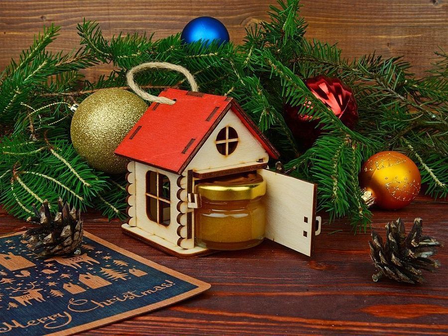 Подарочная упаковка “Домик” выполнена в виде игрушки, которую легко можно поставить на стол, шкаф или повесить на стену. Ее также можно использовать, как елочное украшение или новогодний подарок. Она изготовлена из экологически чистых материалов и обладает чарующим древесным ароматом. В домике открывается дверца, и в него можно поместить небольшую баночку с медом или вареньем. Яркие цвета крыши домиков и эффектная конструкция помогут украсить любой интерьер, как в офисе, так и в квартире. Подарочная упаковка “Домик” позволит вам сделать оригинальный и запоминающийся подарок для руководителя или коллеги.