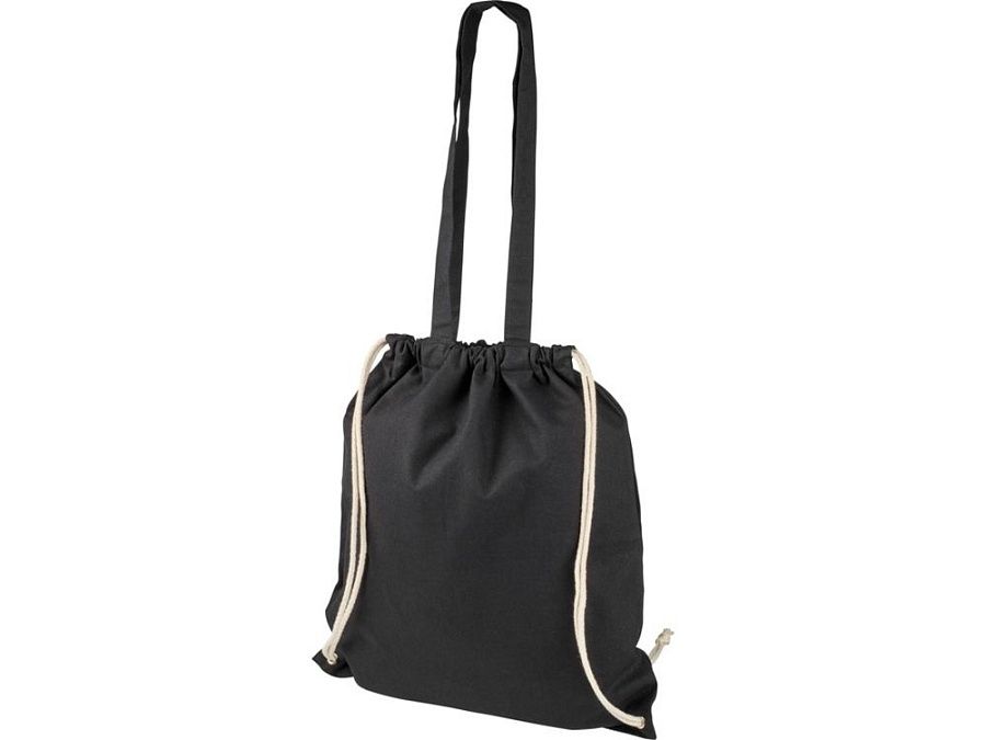 Многофункциональный хлопчатобумажный мешок с длинными ручками и затягивающим шнурком, который можно носить в качестве сумки для покупок или рюкзака. Большой основной отсек, закрывающийся затяжкой шнурка. Имеет две выпадающие ручки длиной 31 см. Вместимость: 16 л, выдерживает до 5 кг веса. Хлопок, 240 g/m2.