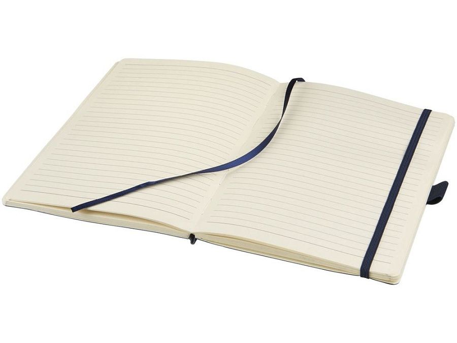 Блокнот Revello. Мягкий на ощупь, гибкий блокнот (размер А5 для ориентации) со встроенной эластичной застежкой, закладкой, петелькой для ручки и кармашка для документов на внутреннем форзаце сзади. 80 листов кремовой линованной бумаги (80г/м2). Упакован в черную коробку-рукав. Кожа ПУ.
