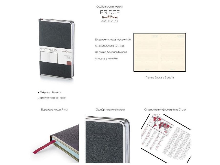 В ежедневнике «Bridge» есть полезная справочная информация на русском языке, а также 272 страницы для записи идей, мыслей и составления рабочих планов. День недели указан на английском языке. Для изготовления страниц используется качественный офсет, тонированного в кремовый цвет (70 г/кв м), который производится в Японии и подходит для всех видов чернил.