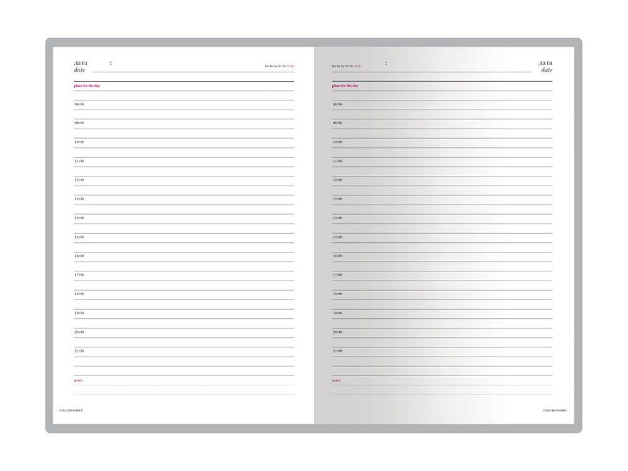 Две строчки на каждой странице отведены на ежедневное планирование. Есть почасовая разбивка страниц. Две последние строчки служат для комментариев. Строгий классический материал, прекрасная практичная альтернатива дорогостоящей натуральной коже. Идеально сочетается с тиснением фольгой.