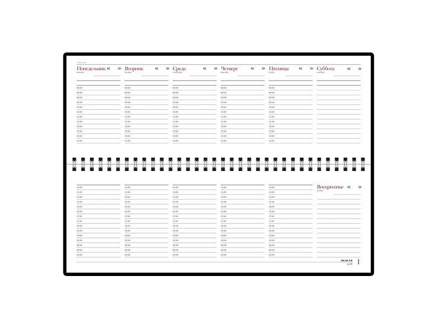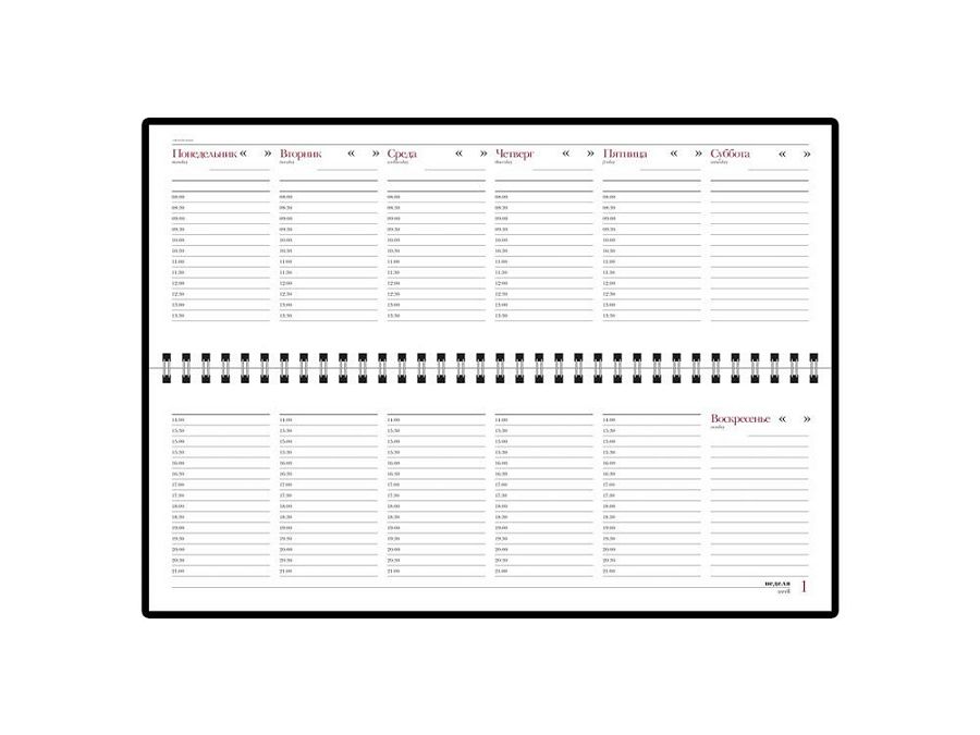 Недатированный планинг выпускается размером 305*130 мм и содержит 128 страниц (блок 292 х100 мм). Для них выбрана высококачественная белая бумага плотностью 70 грамм. Разворот представляет собой разметку на 7 дней недели с графами с указанием времени. Месяц и день недели указаны на русском и английском языках. Первые 15 страниц содержат справочные сведения из различных областей на русском языке. Крепление листов на открытом гребне способствует быстрому переходу по страницам.
