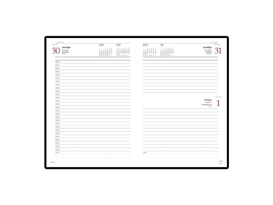 Благородство и статусность придают ежедневнику отстрочка по периметру в тон, скругленные углы, закладка-ляссе бордового цвета, золотой срез.