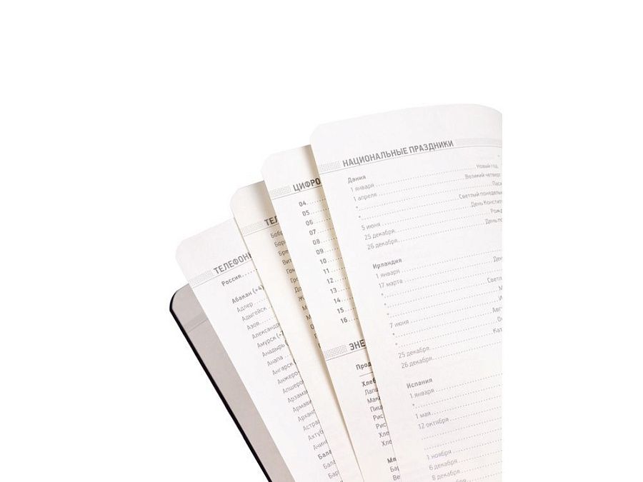 В ежедневнике «Megapolis Flex» есть полезная справочная информация и телефонная книга, а также страницы для записи идей, мыслей и составления рабочих планов. Для изготовления страниц используется качественный бежевый офсет повышенной плотности (70 г/кв м). Блок не привязан к конкретным датам – они указываются в выделенном поле вверху страницы. Тонированная бумага не дает глазам утомиться даже при длительной работе.