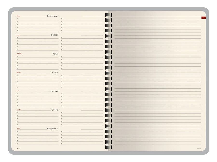 Недатированный блок состоит из 128 страниц, укреплённых на пластиковом полускрытом гребне. На 21 странице размещена справочная информация на русском языке. День недели указан на русском и английском языках.