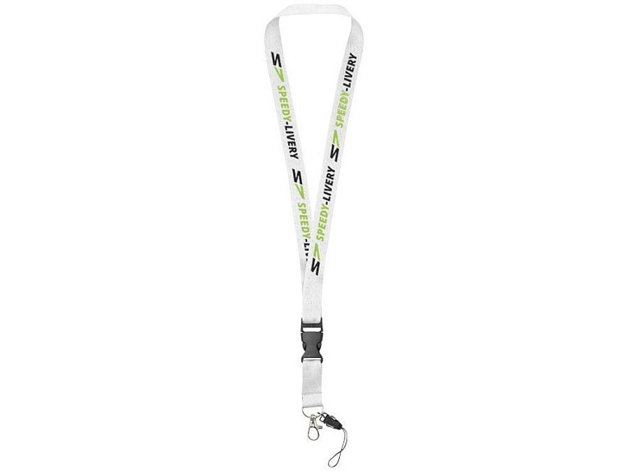 Многофункциональный шнурок с отстегивающейся пряжкой, овальным крючком с зажимом и держателем для телефона. Идеально подходит для бейджа, удостоверения личности или ключей. Предлагается широкий выбор цветов с большим участком для нанесения логотипа. Полиэстер.